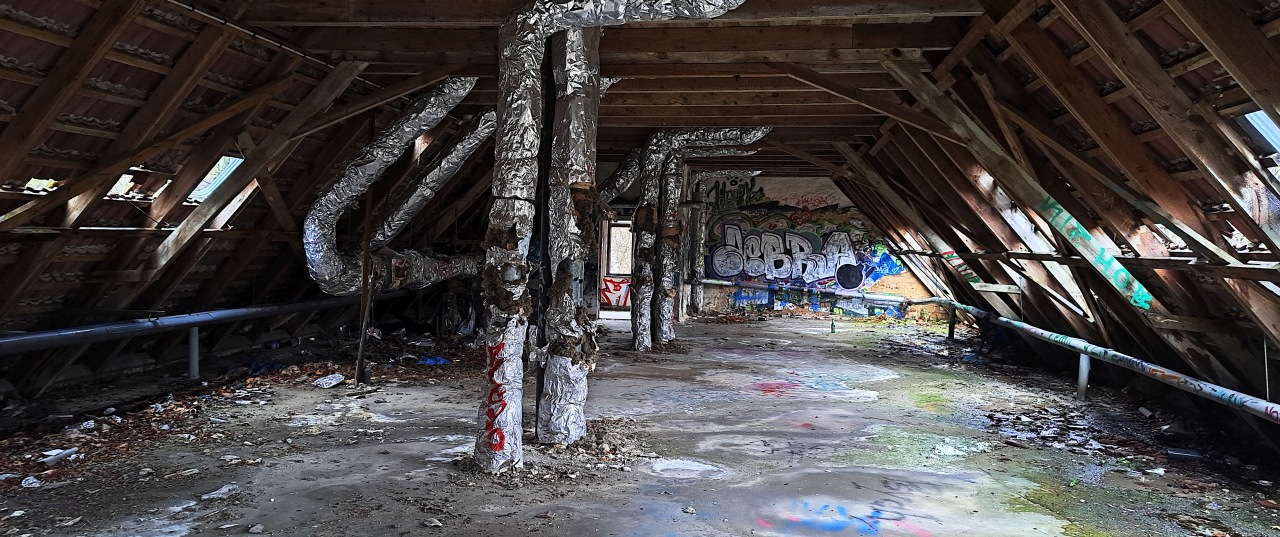 | Dachgeschoss mit Rohrisolierungen | Treppenhaus im Hauptgebäude | |||||||||||||||