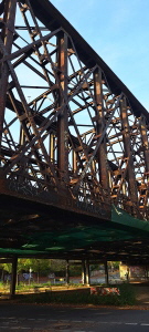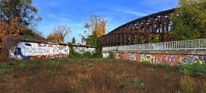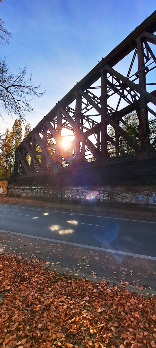 Untergehende Herbstsonne im Stahlfachwerk der Liesenbrücke | Von Pflanzen überwucherte alte Liesenbrücke | Fangnetze unter dem ehemaligen Fahrweg der Brücke, darunter der Kreisel | |||||||||||||||