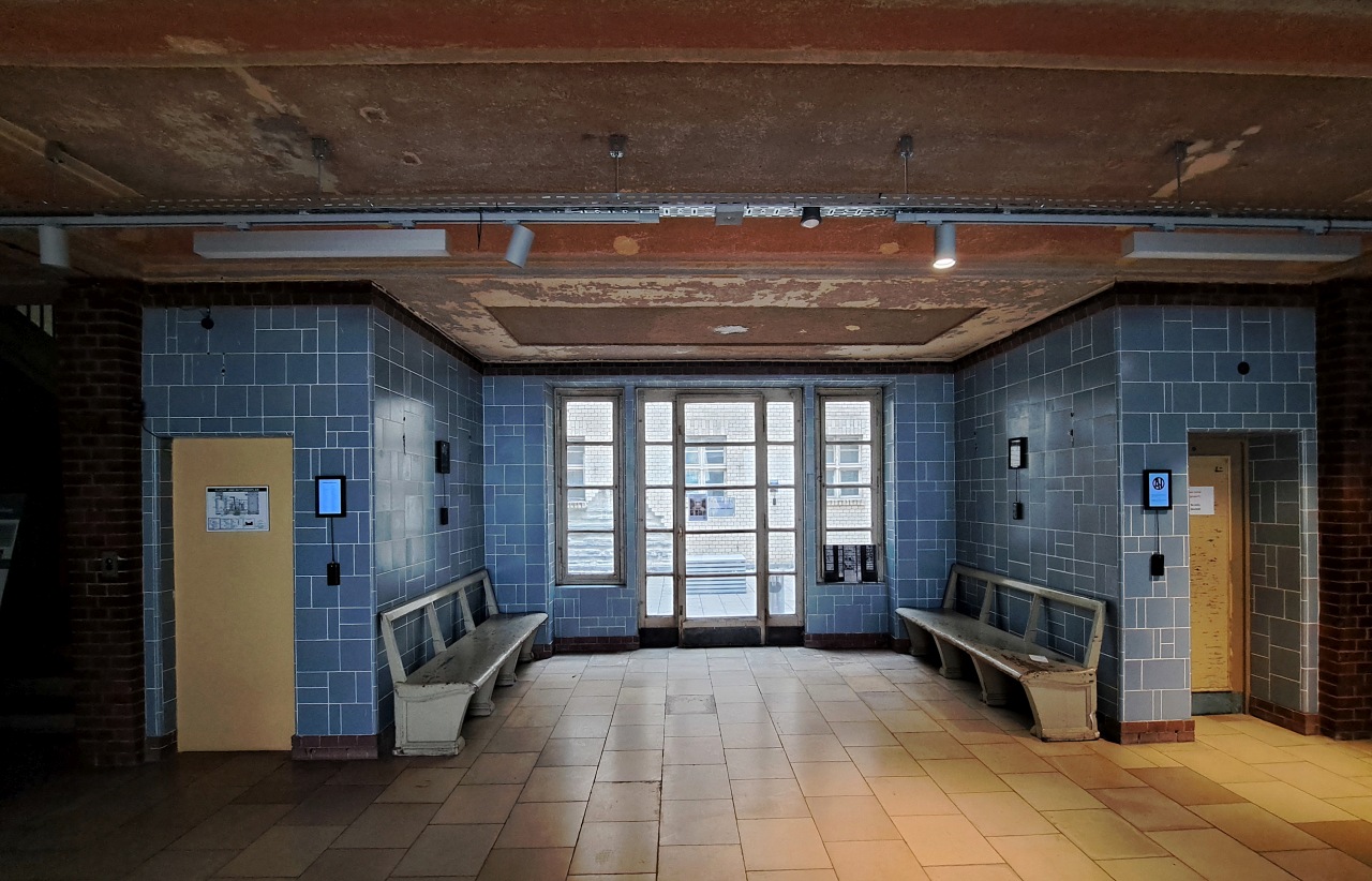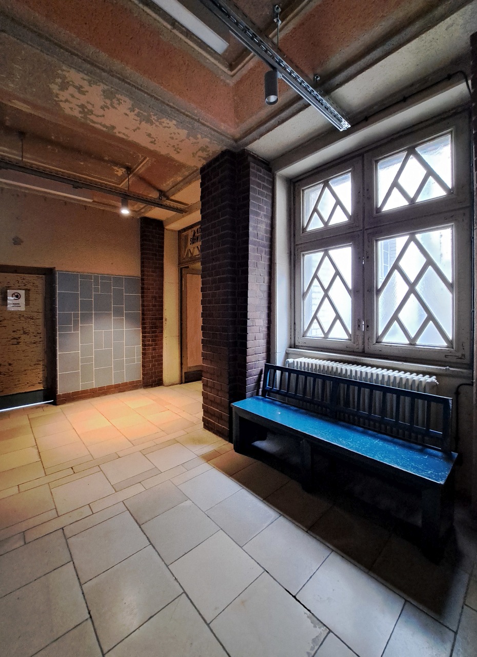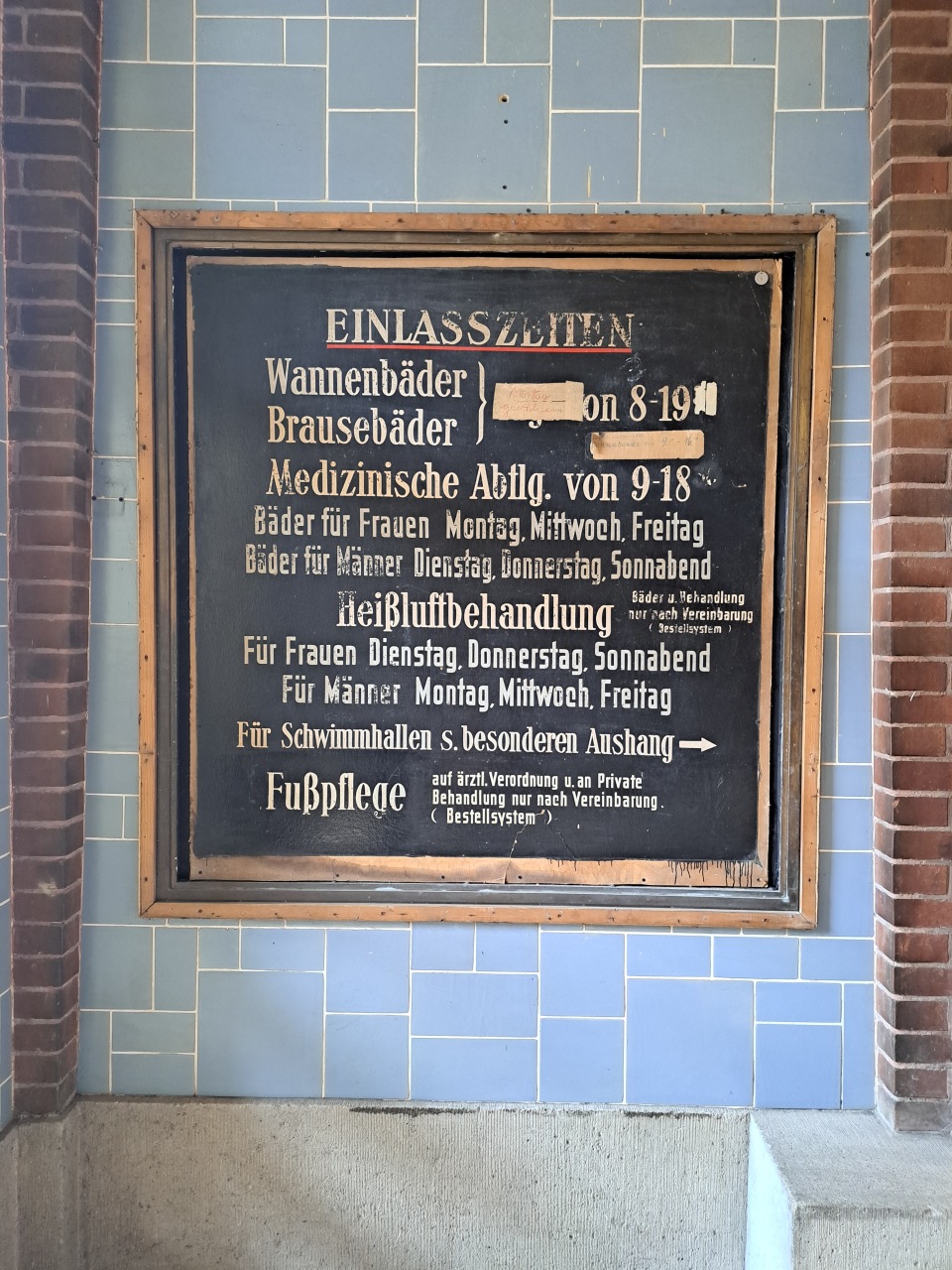 Hinweisschilder und Foyerbereich (rechts) im Eingangsbereich des Schwimmbades | |||||||||||||||||