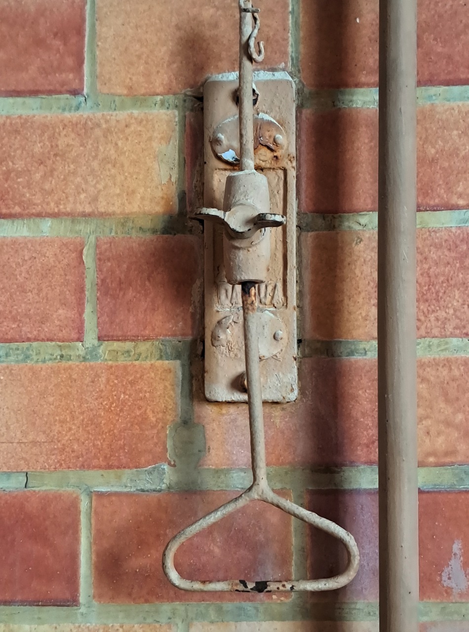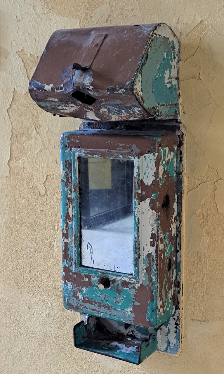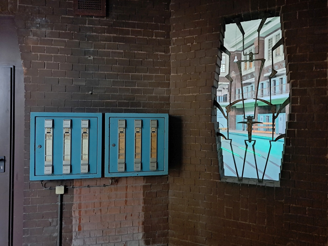 Hinweisschilder und Foyerbereich (rechts) im Eingangsbereich des Schwimmbades | |||||||||||||||||