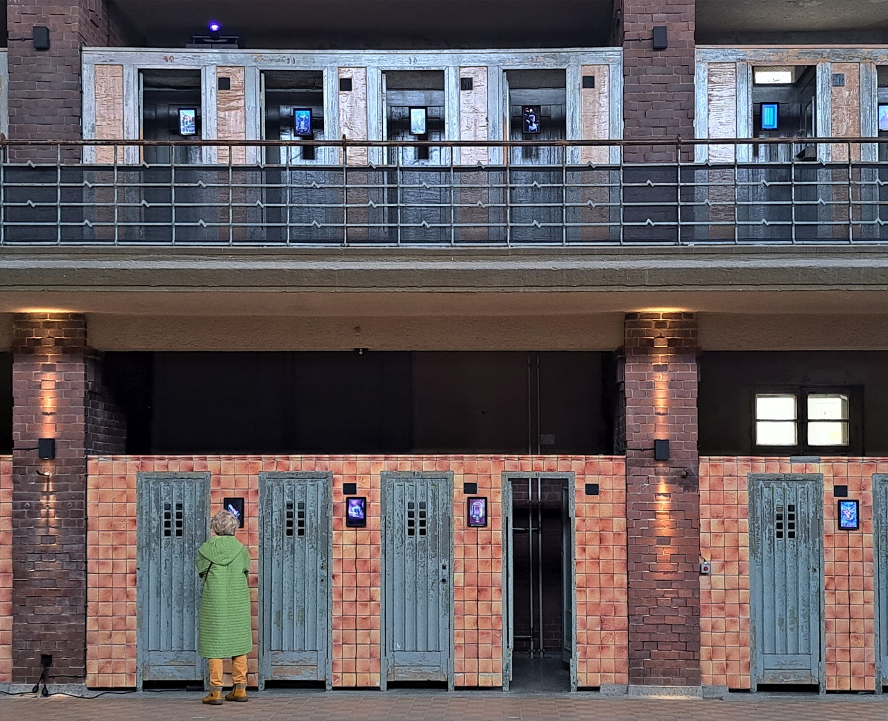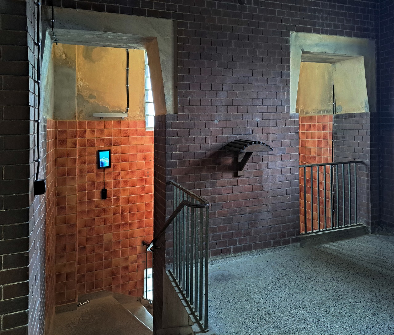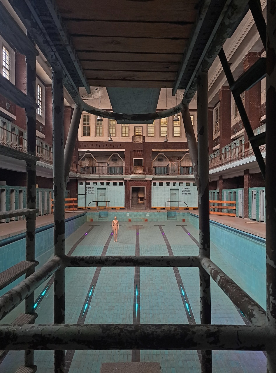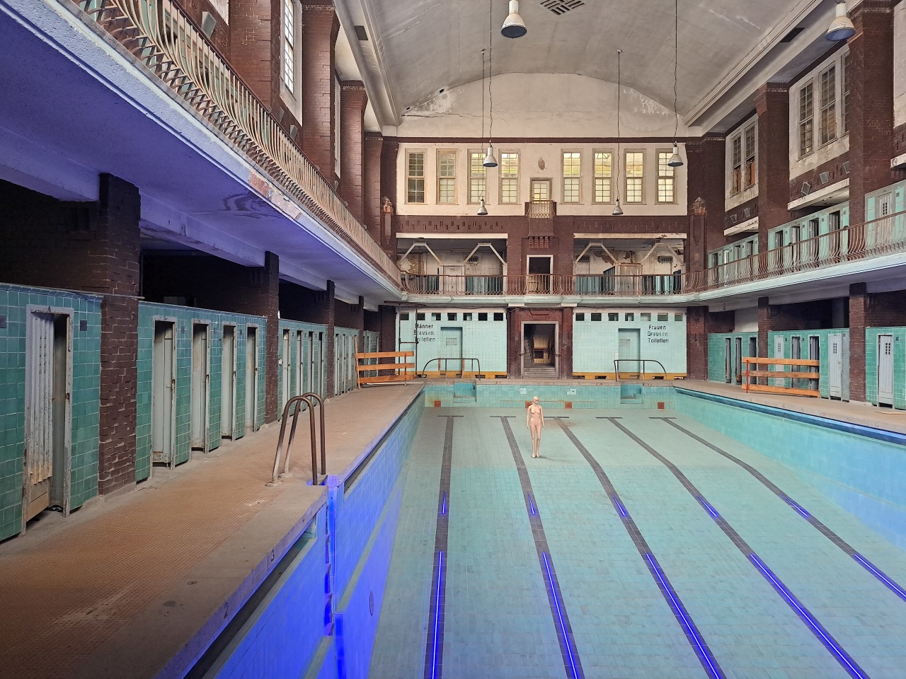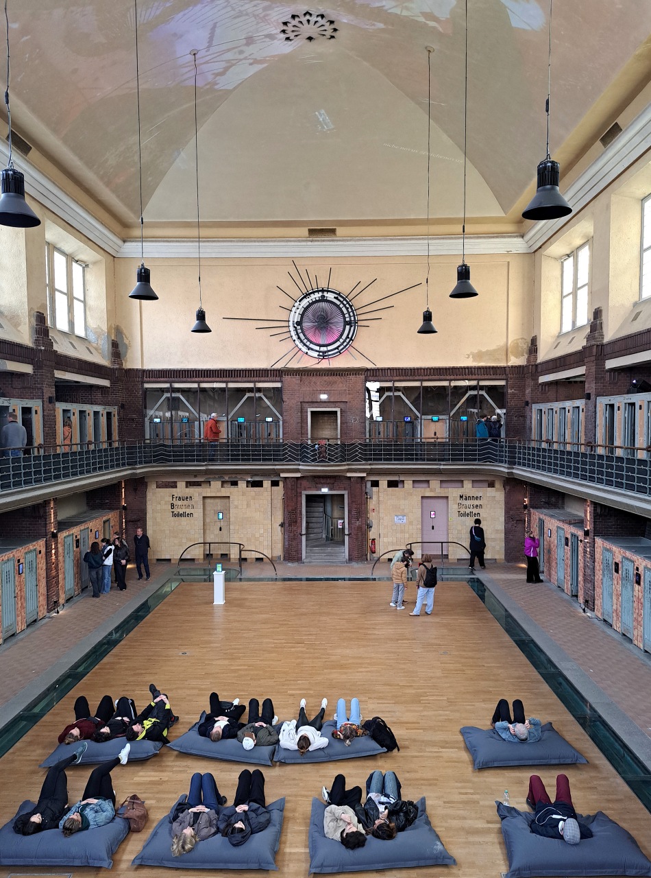 Ausstellungsbesucher liegen auf Textilkissen auf der künstlichen Zwischendecke im Frauenbad und betrachten die auf die Hallendecke projezierte Digitalkunst der Ausstellung Stadtbad Reloaded. | |||||||||||||||||