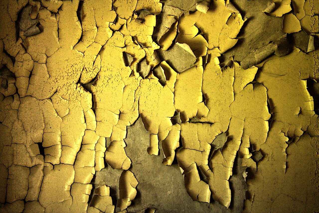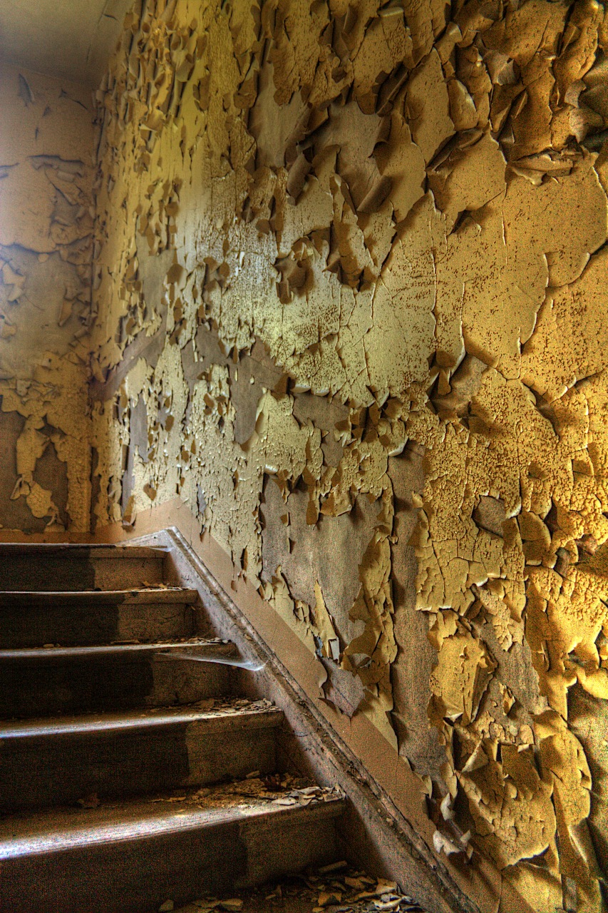 Treppenhaus, Erdgeschoss | Abblätternde gelbe Farbe an den Treppenstufen zum ersten Stock |